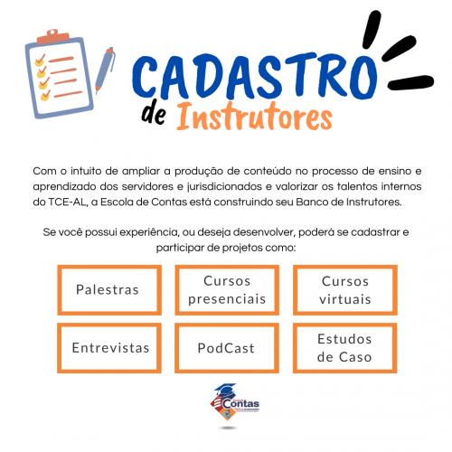 Com o intuito de estabelecer e regularizar a pré-qualificação técnica, bem como proporcionar a participação dos servidores da Corte de Contas do Estado de Alagoas no corpo de instrutores, facilitadores e multiplicadores, a ECPCJAM torna público o procedimento para criar um cadastro de dados de instrutores. O objetivo é convidar servidores interessados a colaborar compartilhando seus conhecimentos em cursos, treinamentos, capacitações, palestras e demais eventos, visando aprimorar a qualificação dos Servidores Públicos, Jurisdicionados e Cidadãos, por meio da Escola de Contas Públicas.
