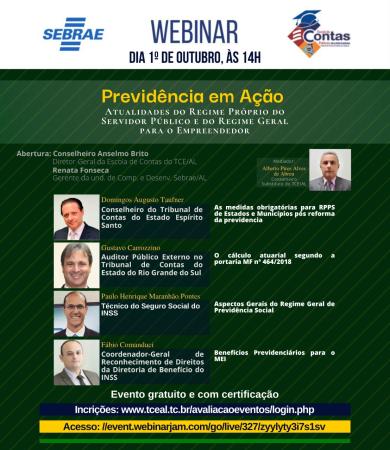 A Escola de Contas Públicas do TCE/AL em parceria com o SEBRAE/AL promoverá, no dia 01/10/2020, às 14h, o Webinar: "Previdência em Ação- Atualidades do Regime Próprio do Servidor Público e do Regime Geral para o Empreendedor."