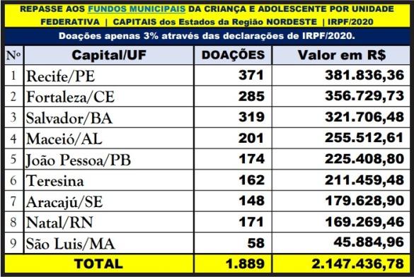Promovida pela Receita Federal (RF), e com apoio do Tribunal de Contas de Alagoas, a “Campanha Destinação” tem o objetivo de estimular os contribuintes a doar parte do Imposto de Renda (IR) devido para projetos sociais e culturais. Em Maceió, foram realizadas 201 doações, resultando em R$255.512,61. A capital alagoana ficou em 4º lugar no ranking das capitais do Nordeste.