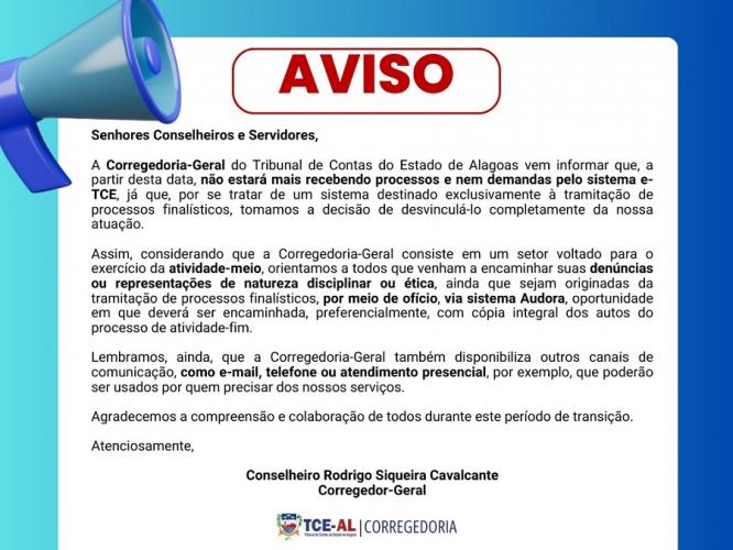 A Corregedoria-Geral do Tribunal de Contas do Estado de Alagoas vem informar que, a partir desta data, não estará mais recebendo processos e nem demandas pelo sistema e-TCE, já que, por se tratar de um sistema destinado exclusivamente à tramitação de processos finalísticos, tomamos a decisão de desvinculá-lo completamente da nossa atuação.
